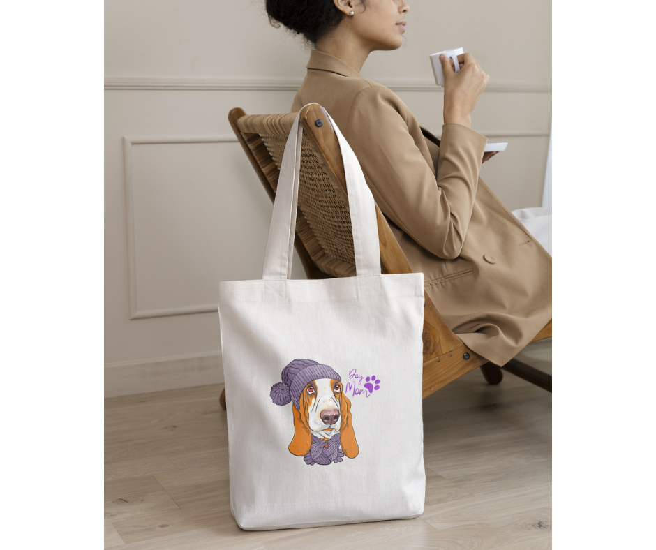 This durable tote bag is the perfect accessory for the proud canine mom! Featuring a cute basset hound graphic with the words "dog mom" this bag is sure to make any pup parent stand out. Show your love for your four-legged friends!